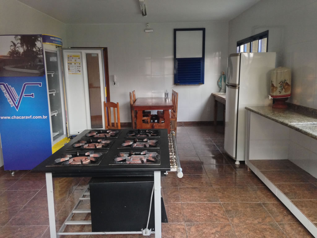 • Cozinha com fogão industrial, gás encanado, freezer, geladeira.
